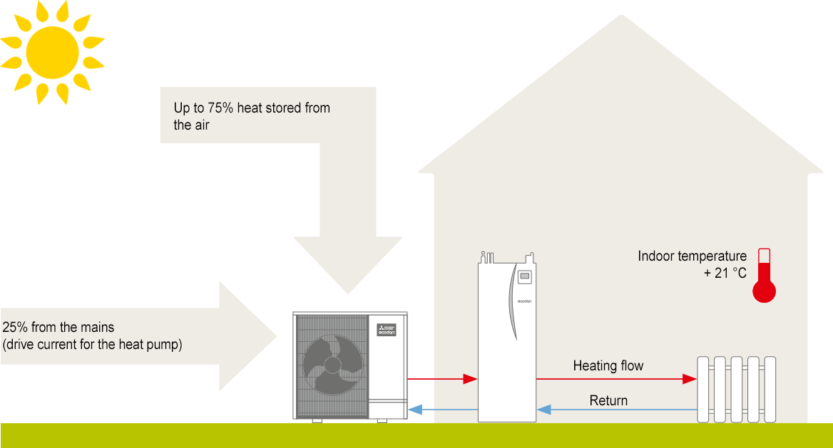 The Ecodan outdoor unit uses electricity to absorb freely available thermal energy from the ambient air and then transfers this energy into your home.