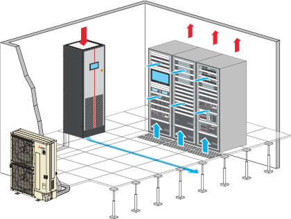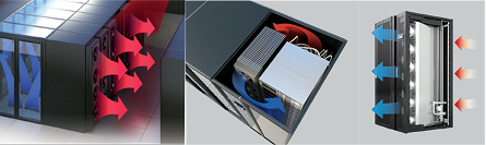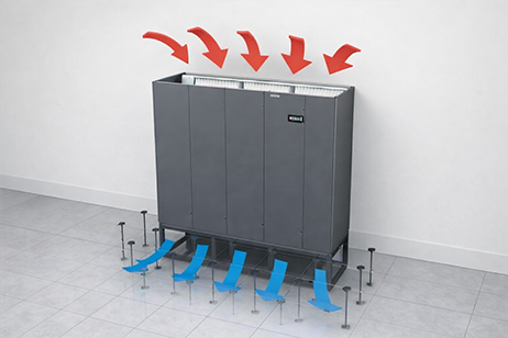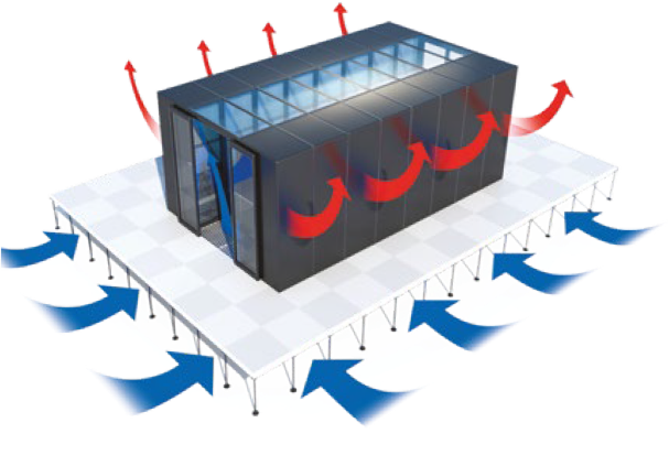 Те засмукват топлия въздух от сървърните шкафове, а охладеният обработен въздух се подава под повдигнат под и преминава през решетки към предната част на шкафовете. Така в помещението се оформят горещи и студени коридори.