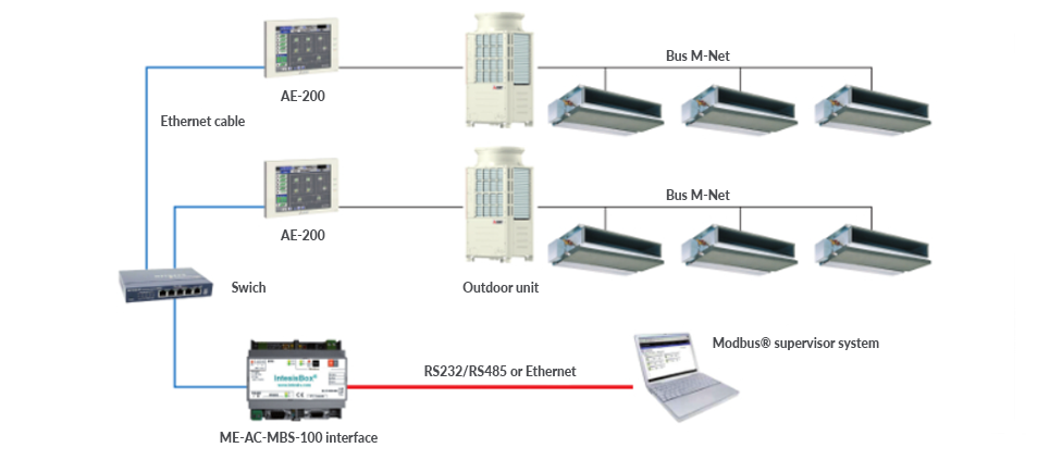 - Mitsubishi Electric предлага интерфейс, който може да контролира до 100 вътрешни тела (ME-AC-MBS-100) за управление на VRF CITY MULTI инсталация с BMS система.